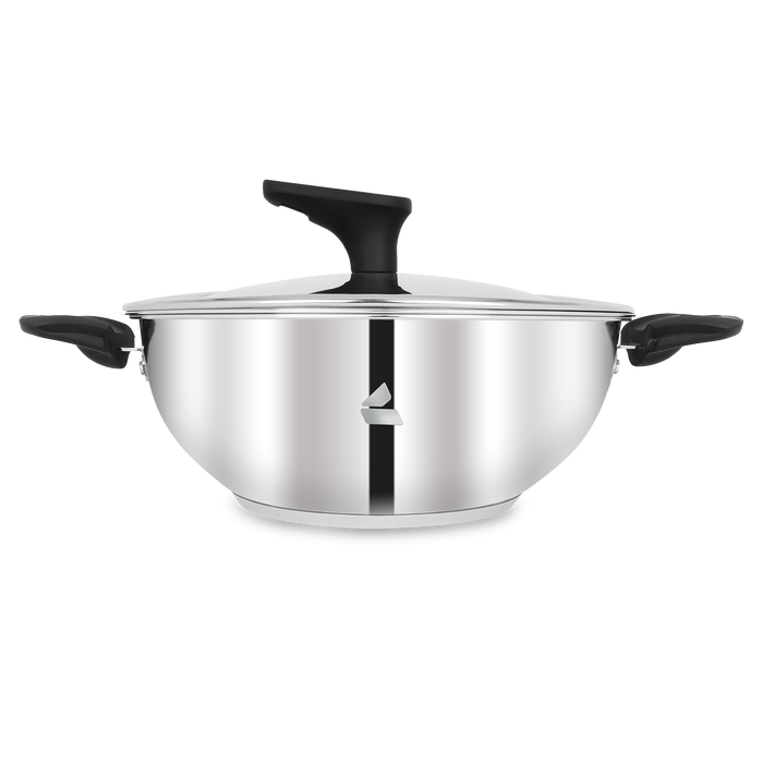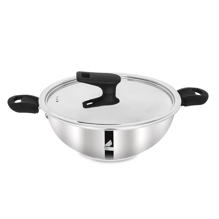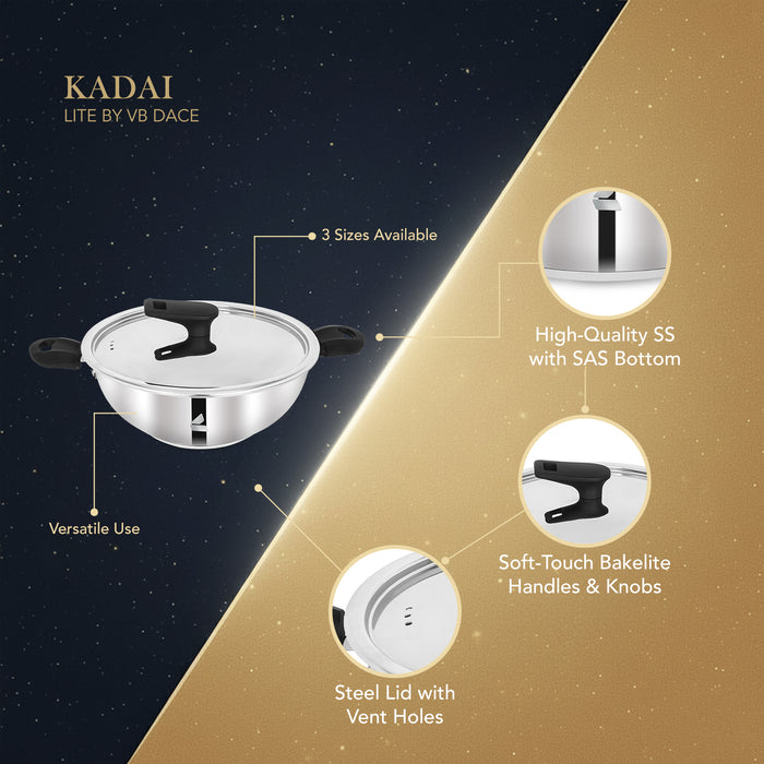 Our Stainless Steel Kadai with Sandwich bottom is designed for even heating and efficient cooking. Available in 3 sizes, it features soft-touch Bakelite handles and knobs for a comfortable grip and safe handling. The Kadai comes with a Stainless Steel Lid with vent holes to allow steam to escape. Perfect for frying, sautéing, and preparing curries in everyday kitchens.